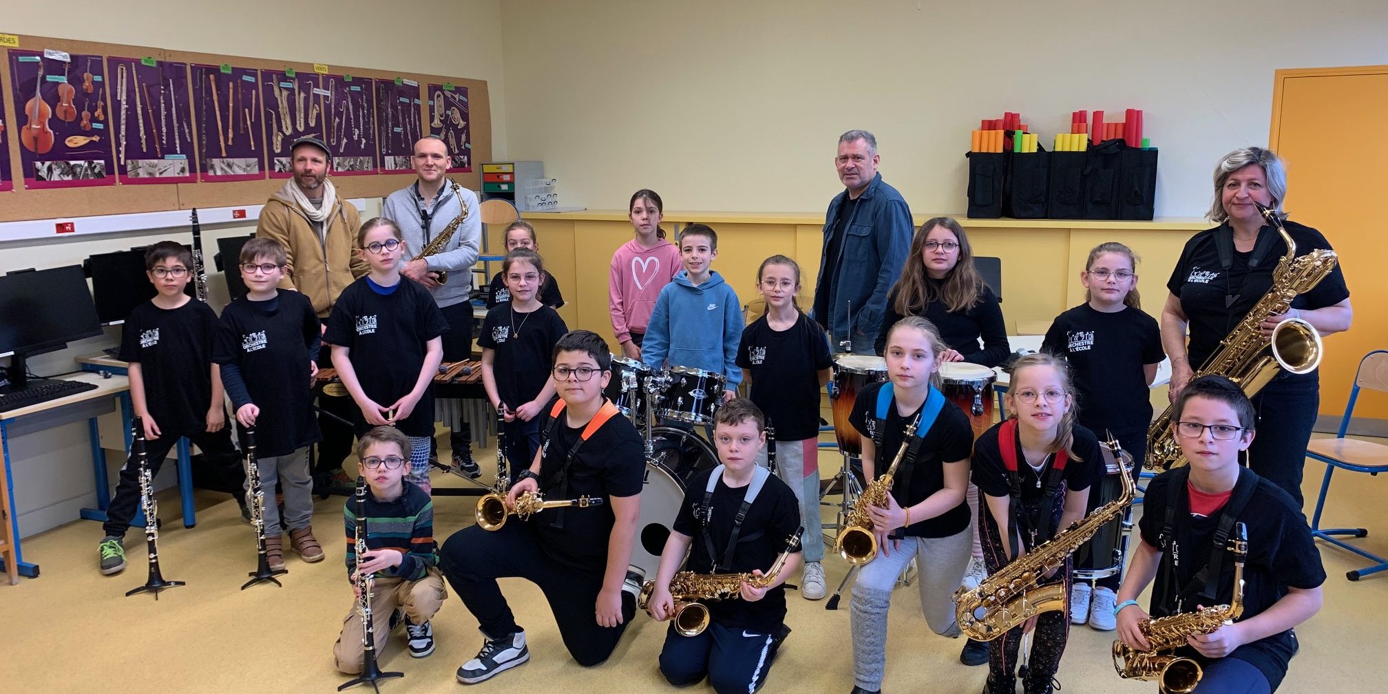 Layana, Glorie, Lucia et Louison pratiquent les percussions, Manu joue du saxophone et Catteleya de la clarinette.