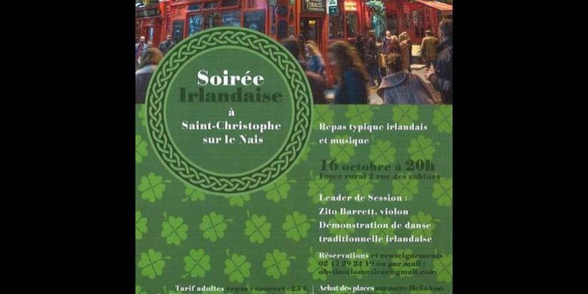 Le samedi 16 octobre la commune de Saint Christophe sur le Nais se met à l’heure irlandaise. Par le biais de l’association Obstinatio Musicae, chanteurs, danseurs et musiciens vous proposeront une soirée placée sous le signe de l’Irlande jusque dans les assiettes. Jacky Brun président de l’association Obstinatio Musicae et Nina, directrice artistique de cette dernière sont nos invités pour l’interview du jour de ce mardi 12 octobre à 18h, mercredi 13 à 13h, samedi 16 entre 14h et 15h et dimanche 17 entre 11h et 12h.