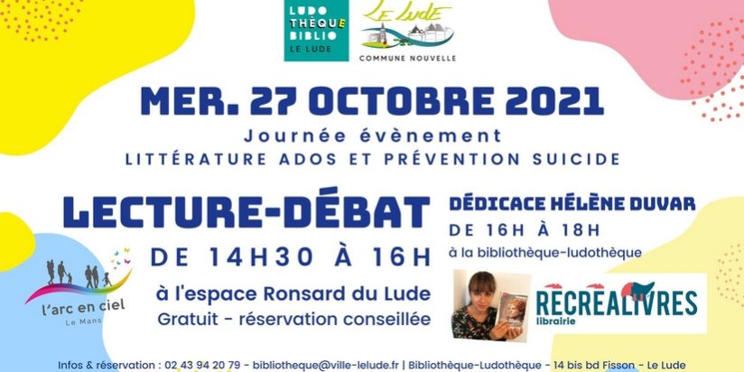 Mercredi 27 octobre se déroulera à la bibliothèque ludothèque du Lude une lecture-débat autour du livre “Mon Eden” de l’autrice Hélène Duvart. L’association L’arc en ciel sera présente pour débattre du deuil, le livre faisant référence au suicide. Marie-Christine PRIOLLAUD, présidente de l’association L’arc en ciel est notre invitée pour l’interview du jour de ce lundi 25 octobre 18h, mardi 26 13h, samedi 30 entre 14h et 15h et dimanche 31 entre 11h et 12h.