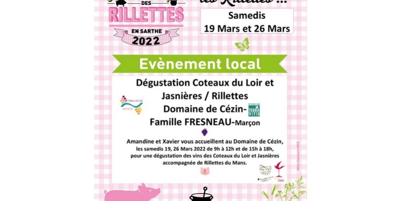 Ce week-end commencera la 5ème édition du printemps des rillettes en Sarthe. Beaucoup d’animations de prévues dans le département. Le domaine de Cézin à Marçon vous ouvre ses portes pour des dégustation rillette/vin. Amandine Fresneau, propriétaire du domaine de Cézin est notre invitée pour l’interview du jour ce mercredi 16 mars 18h, jeudi 17 13h, samedi 19 14h et dimanche 20 11h.